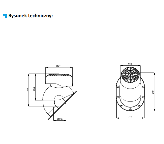 ● średnica: Ø110 ● materiał: PP stabilizowany na promienie UV, EPDM ● waga netto 2 kg ● waga brutto 2,65 kg ● rodzaj pokrycia gont bitumiczny, papa, pokrycia płaskie ● rodzaj kominka wywietrznik kanalizacyjny ● kąt regulowany 5- 45 ● wbudowana poziomica WASSERWAAGE