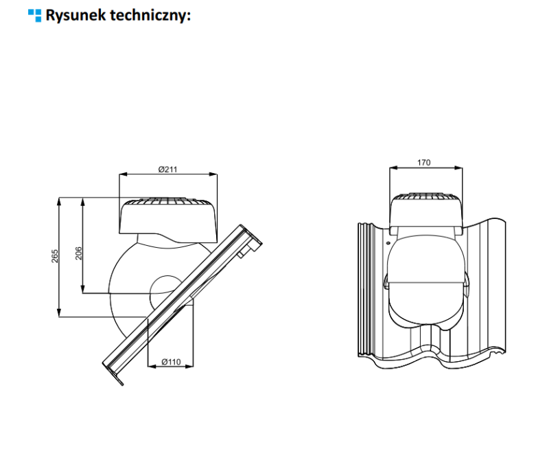 ● średnica: Ø110 ● materiał: PP stabilizowany na promienie UV, EPDM ● waga netto 2 kg ● waga brutto 2,65 kg ● rodzaj pokrycia dachówka betonowa ● rodzaj kominka wywietrznik kanalizacyjny ● kąt regulowany 5- 45 ● wbudowana poziomica WASSERWAAGE